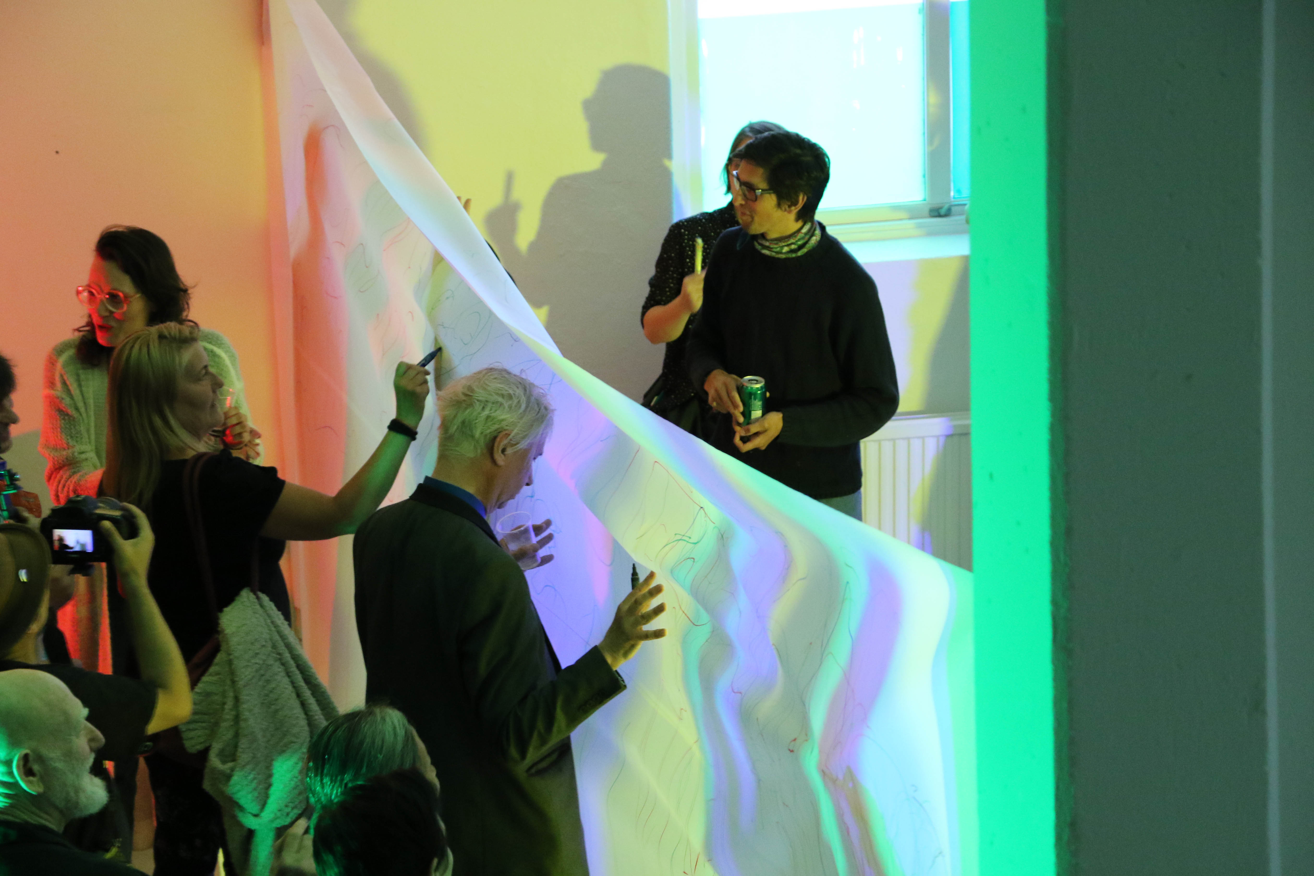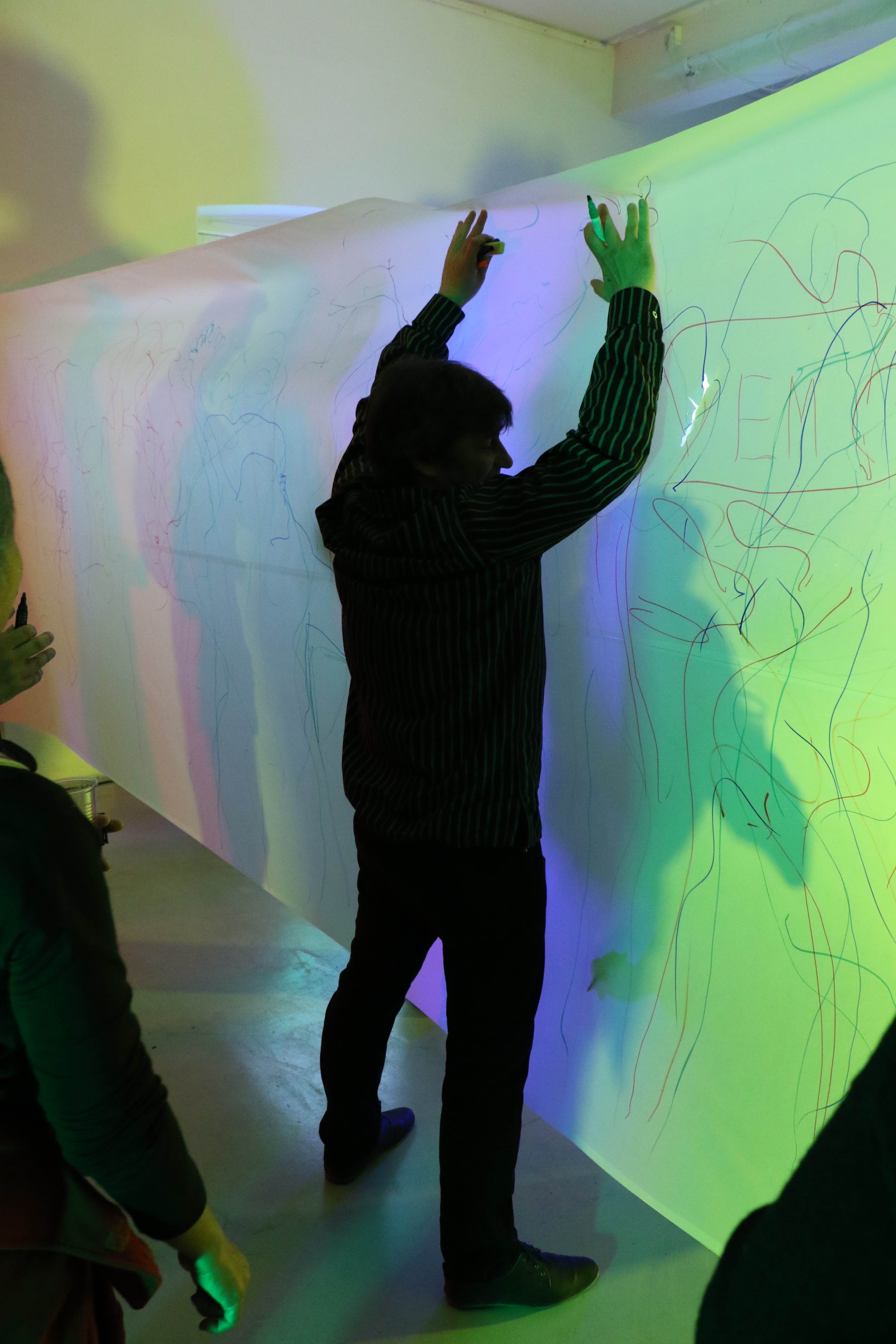 Resulting collective drawing is reveald instantly by switching off color lamps and swithcing on ordinary ceiling lights.