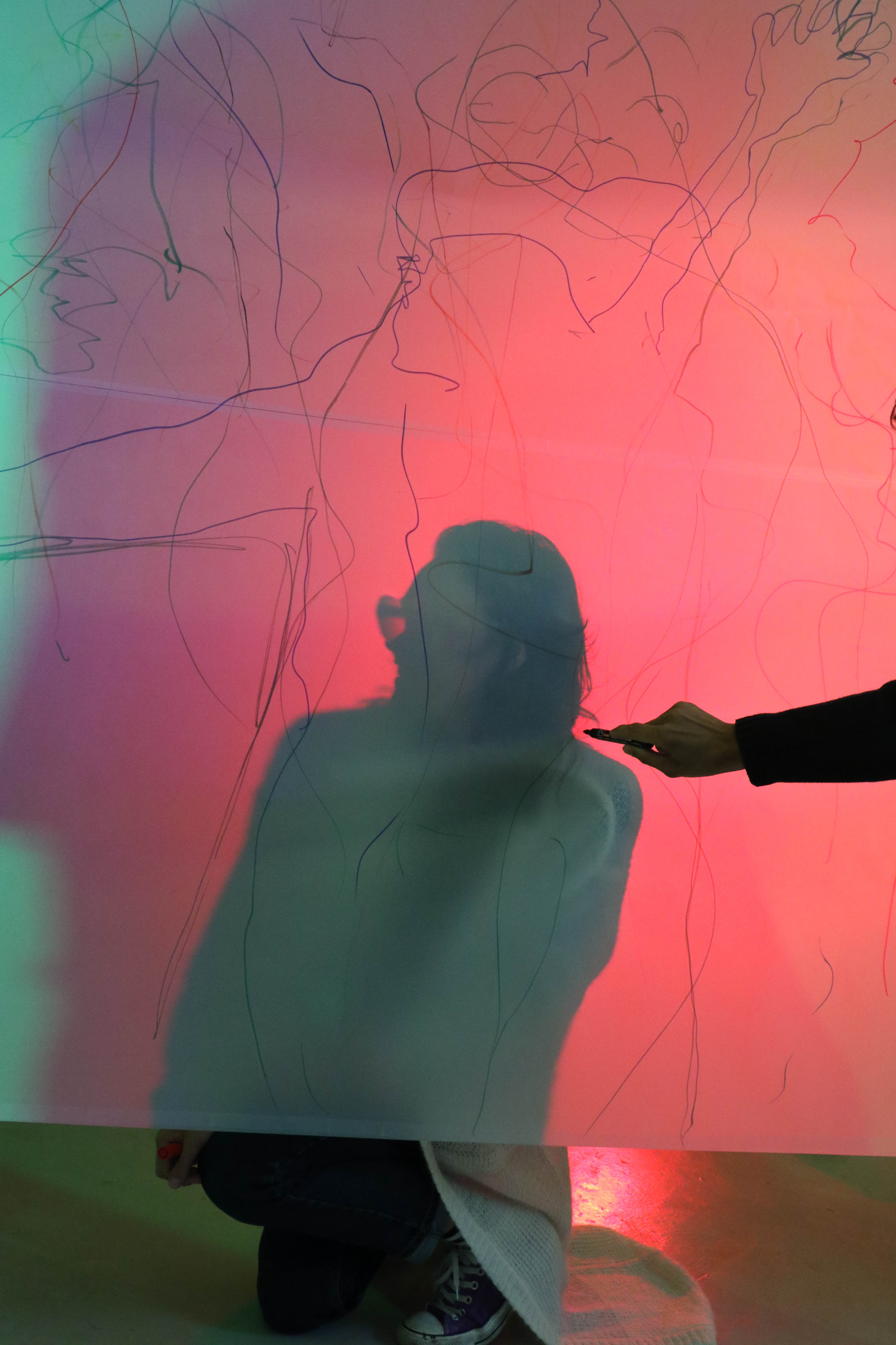 Realising at once that fulfilling the task directly is impossible, participants assumed various roles and behaviours in posing, freezing in place, chaising each others shadows, drawing randomly, etc. living traces of the interactions by marker pens.