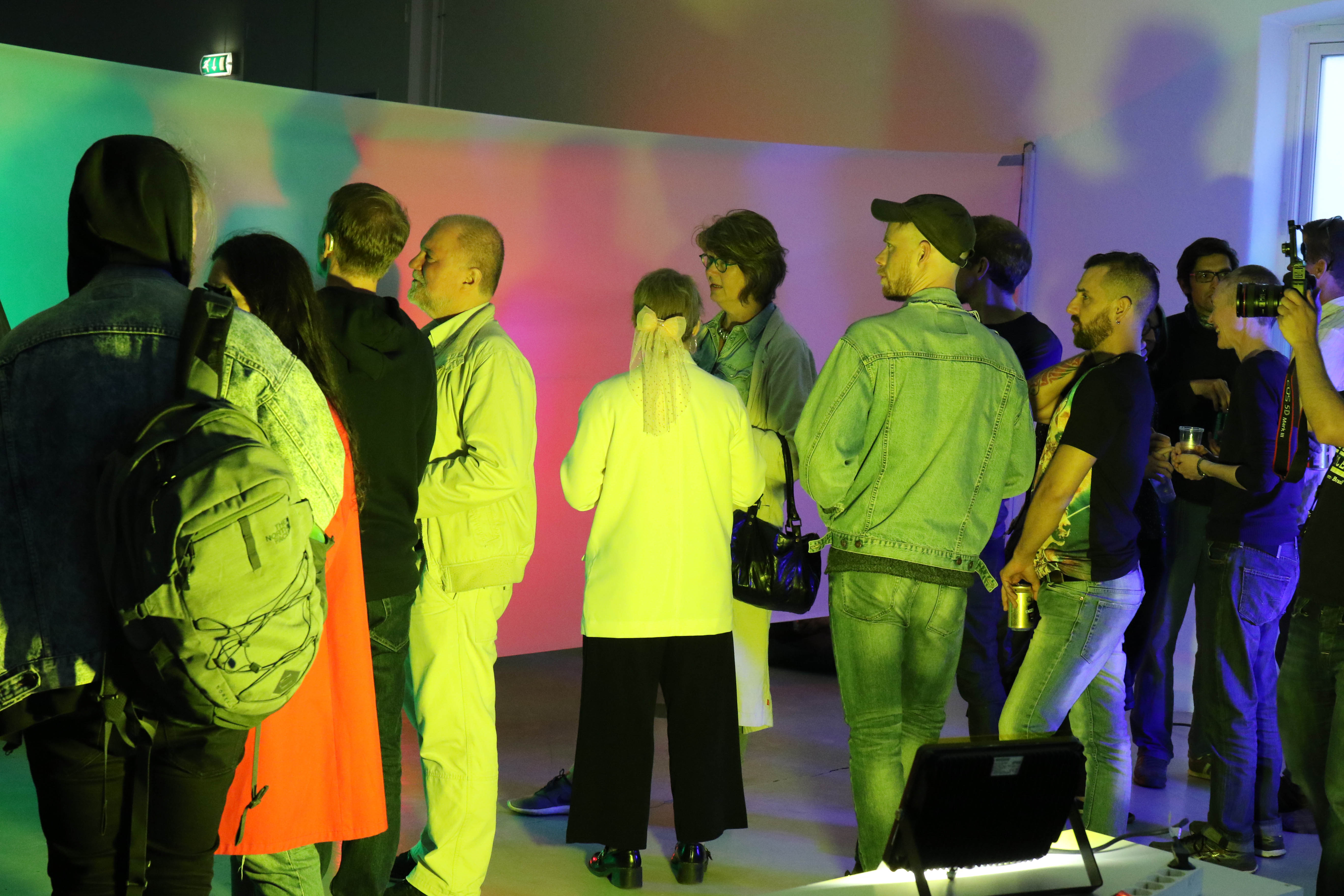 The audience and the room are divided by halv-transparent paper. Four coloured light sources in the corners of the room are creating dual shadows of each participant approacing the papper. Participants barely able to see their own shadows due to halv-transparent paper and the light setup, on the contrary shadows casted from the other side of paper are much more distinct, besides all shadows are colored by complimentary colors from the lamps. All this seeds a doubt and confusion about all casting the shadows.