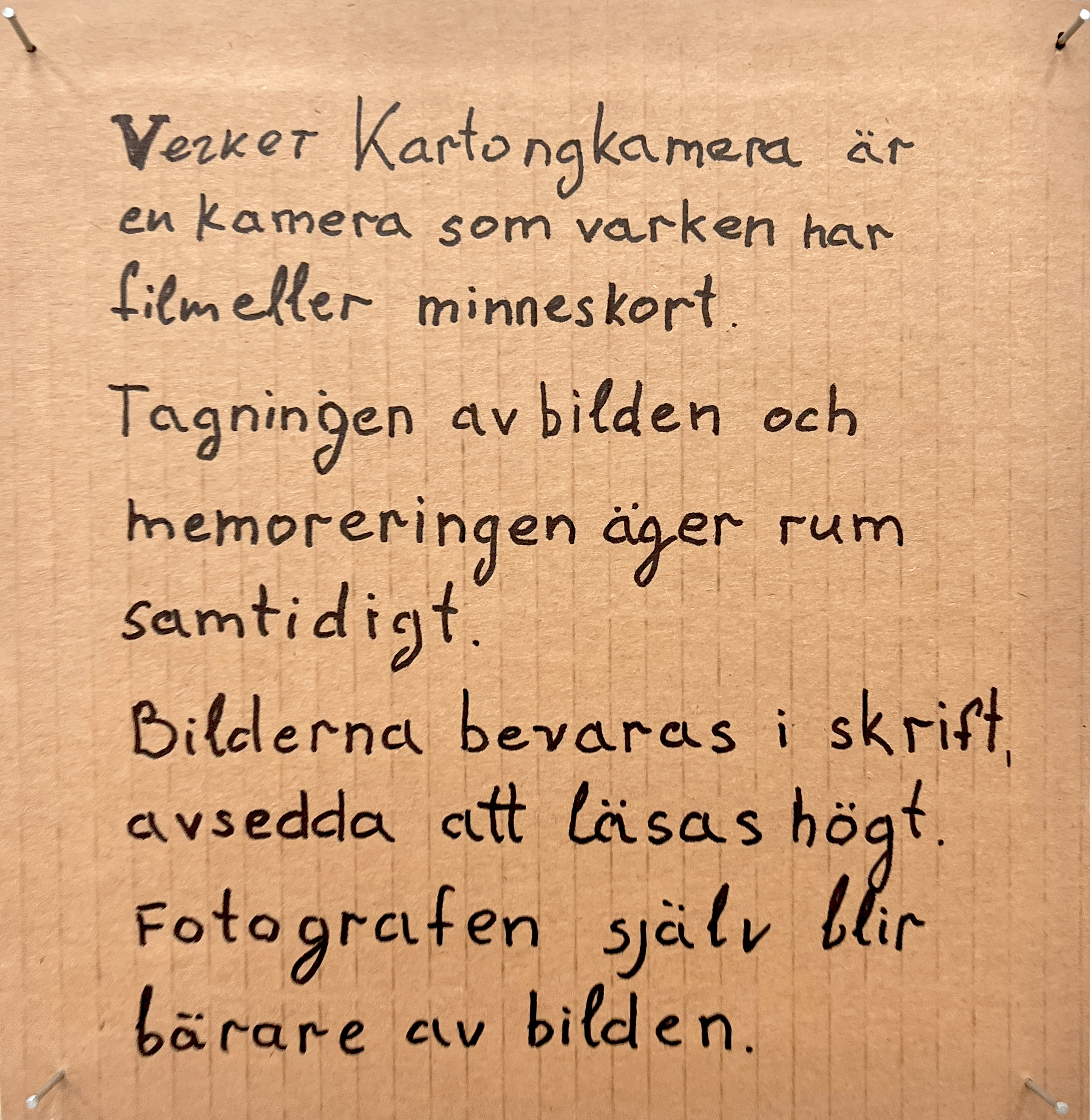 Cardboard Camera is a camera without a memory card or a film. A photographer herself is a carrier of an image. An image still can be shared with others in form of a text, description, or a promt if you like to call it that way.