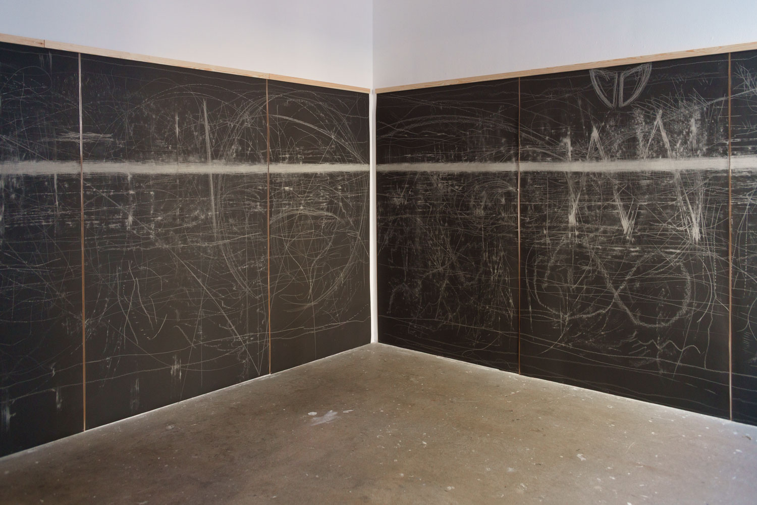 The line – simple, almost innocent – is repeated until it fills the entire room. When does an action become a habit, a norm? What does it mean when a mark is left without thought? Whose innocence are we defending?