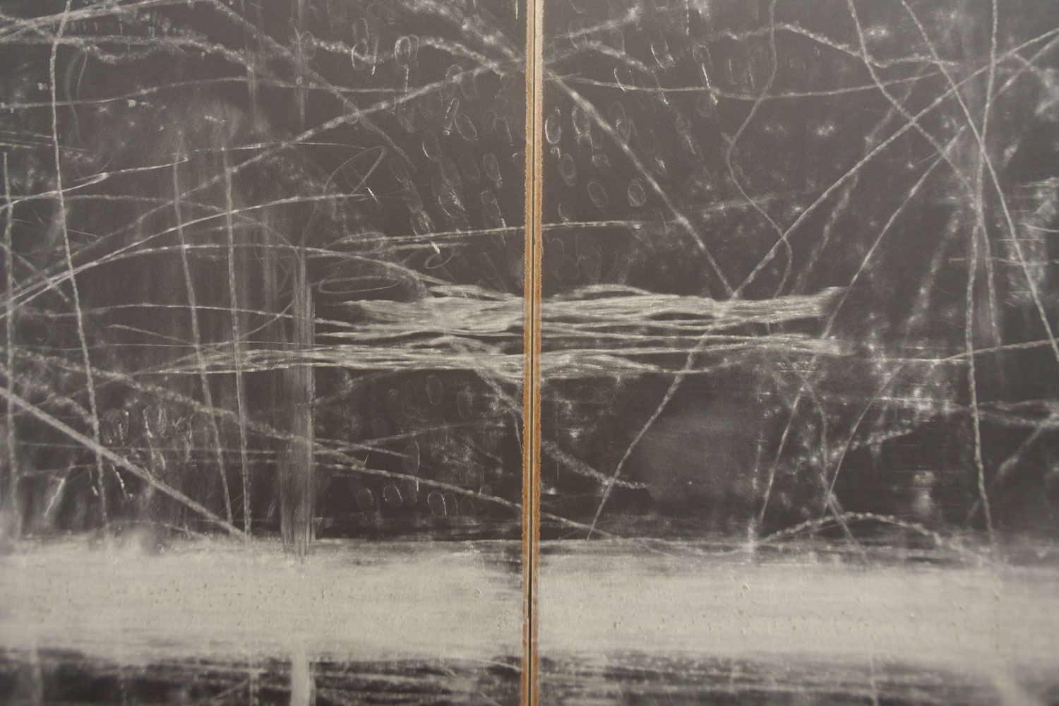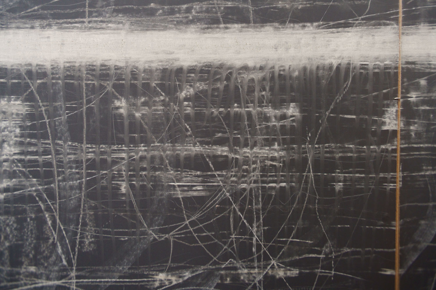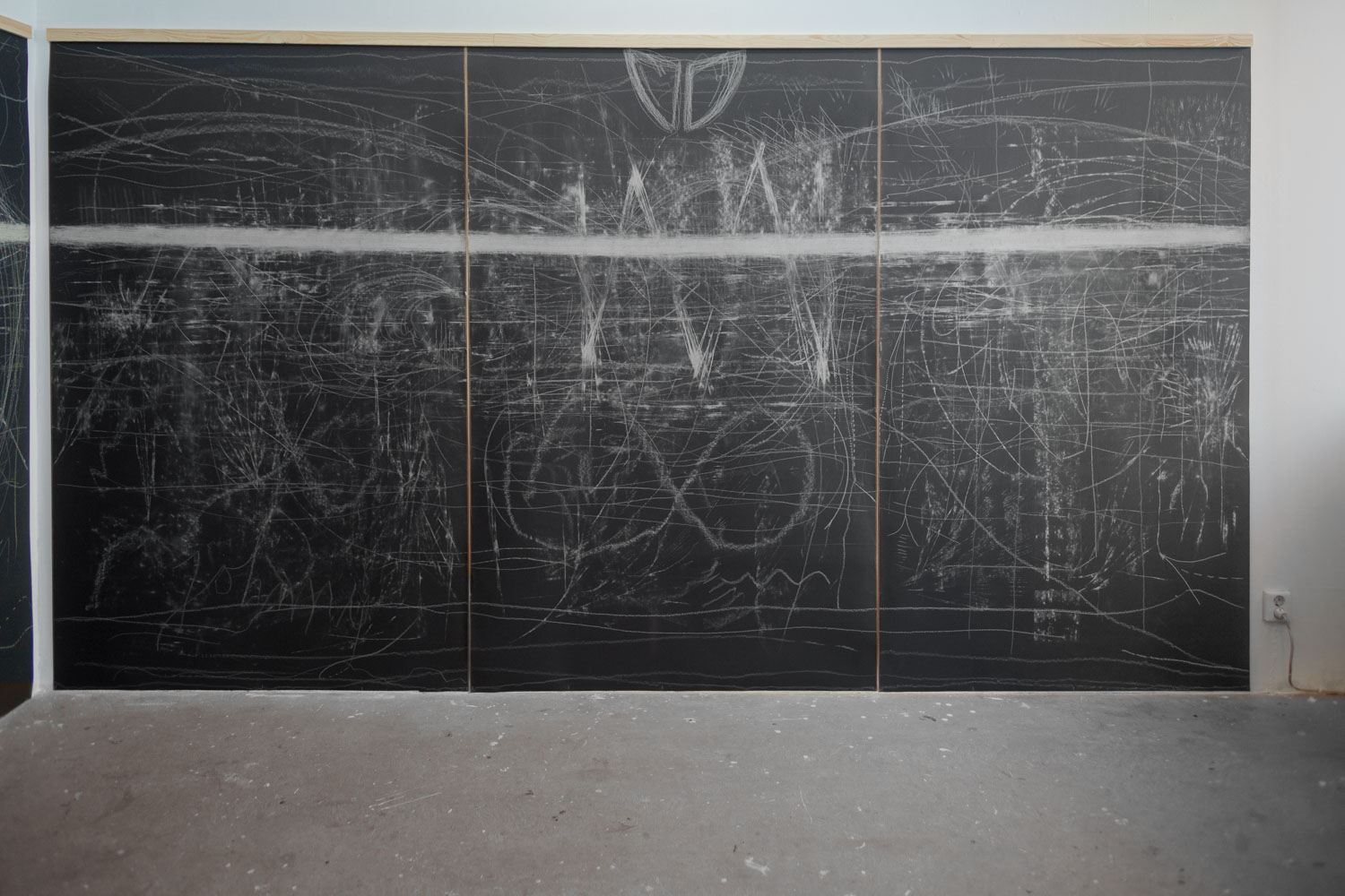 In this room, the walls are covered with black sandpaper – a surface that both resists and invites touch. You, the viewer, become a participant. By carving horizon lines, you contribute to a collective trace, a silent repetition of a gesture that leaves marks. Every gaze seeks its vanishing point.
