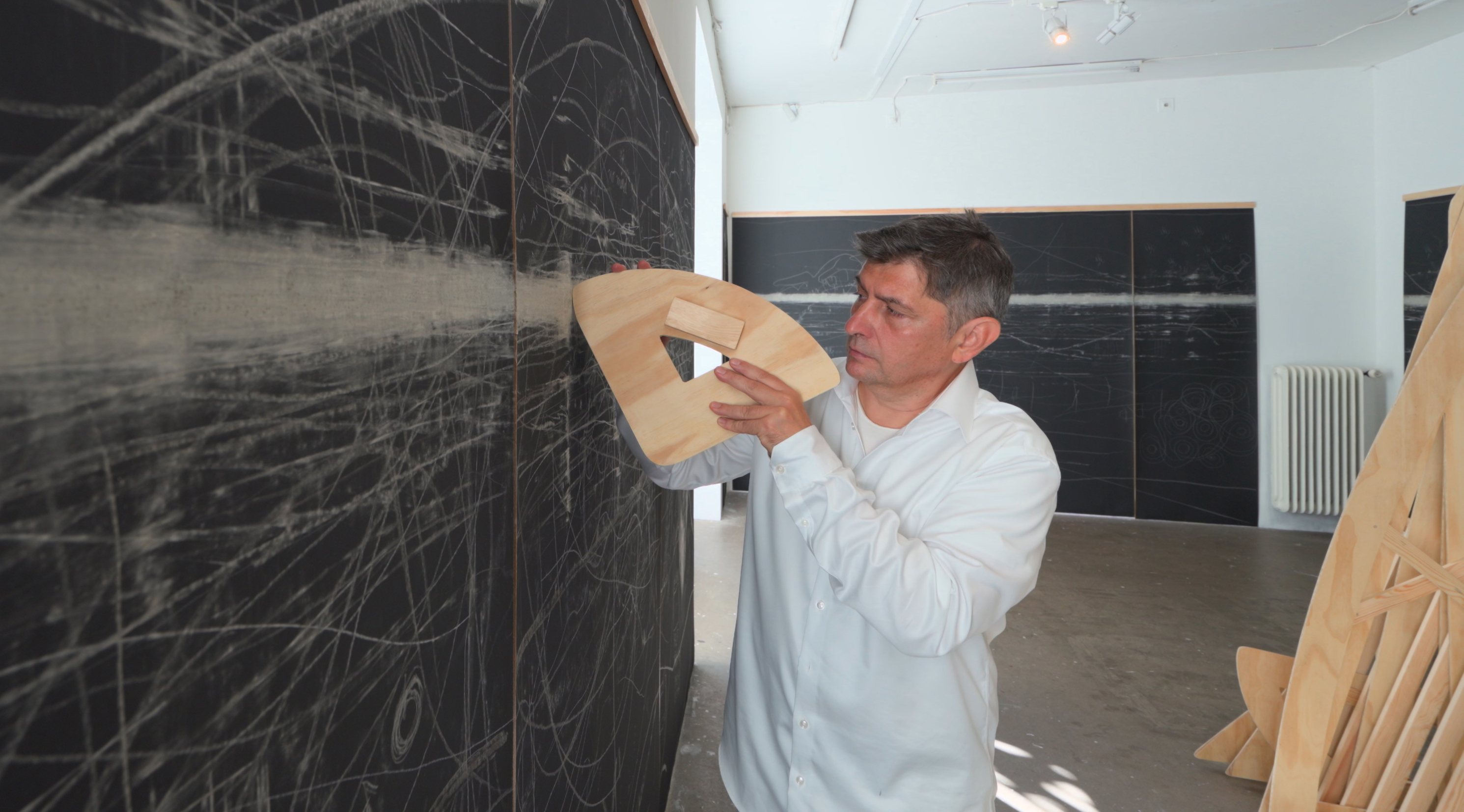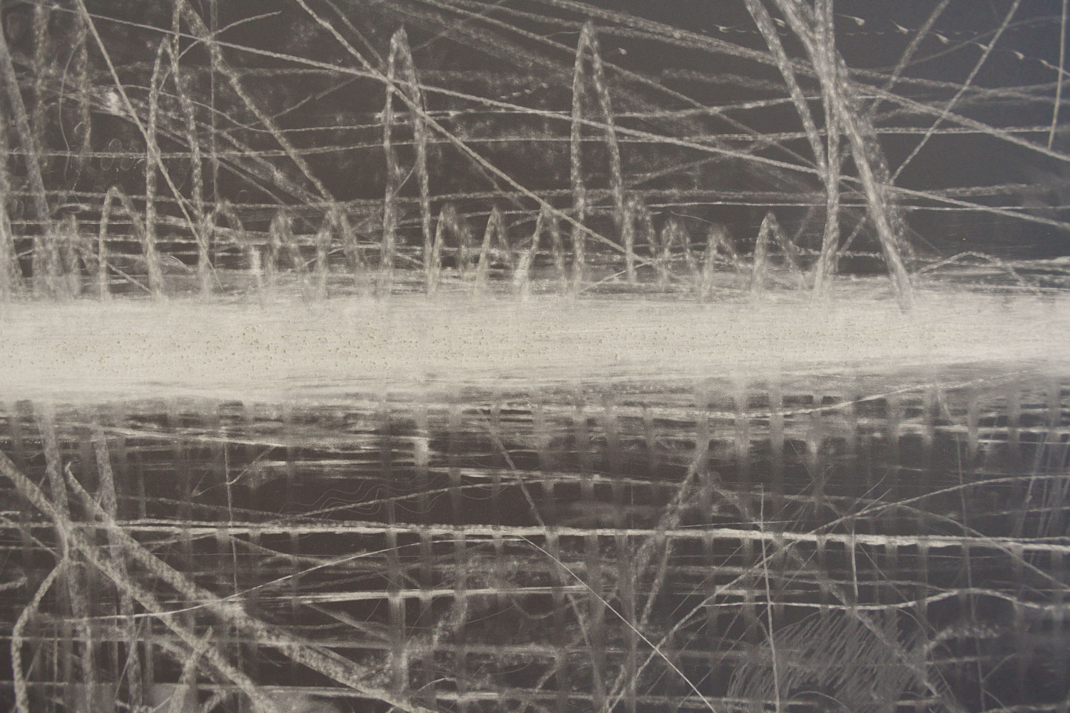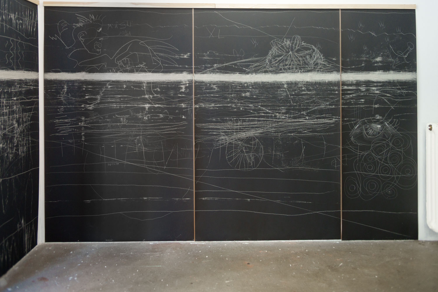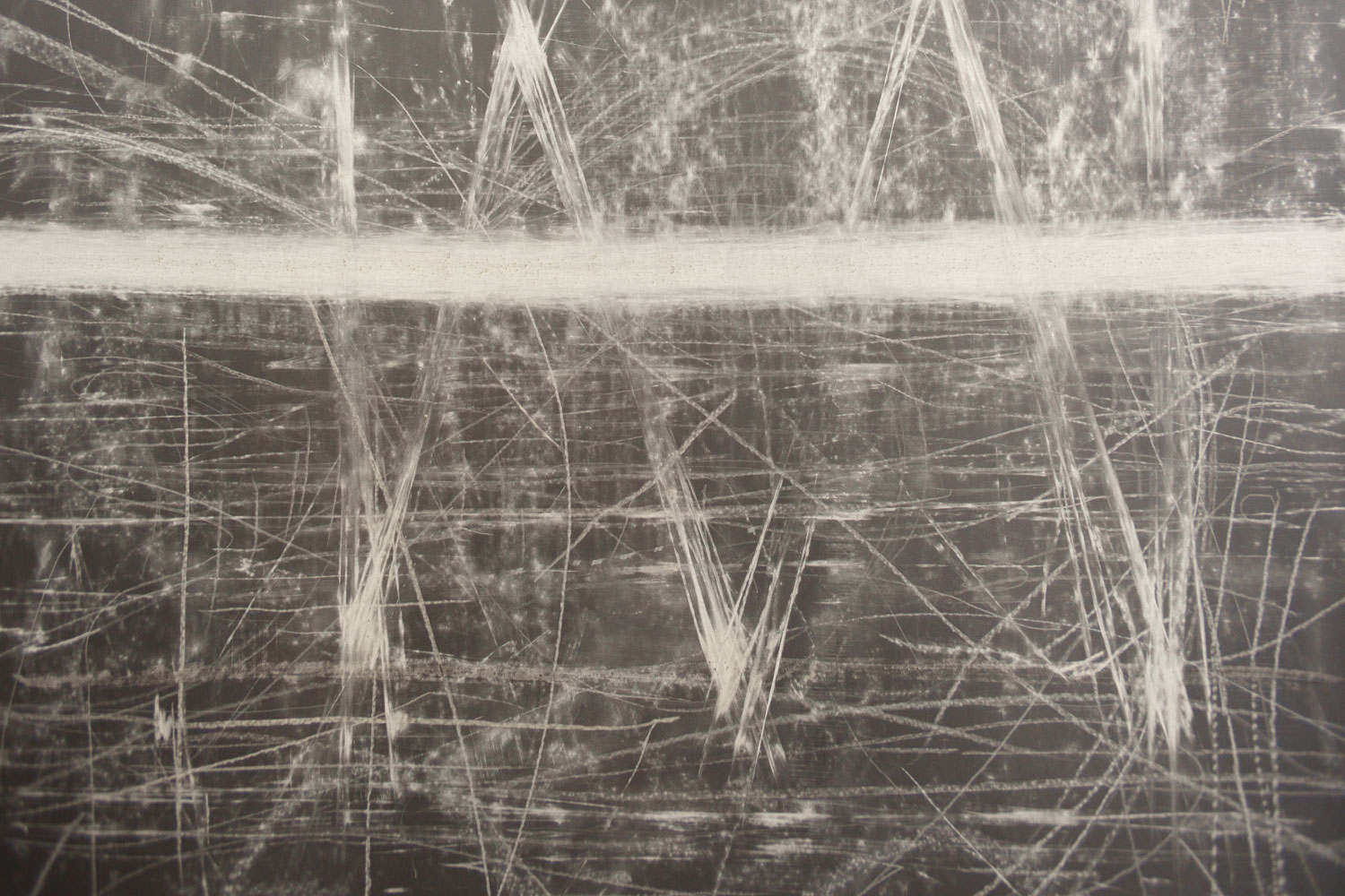 In this room, the walls are covered with black sandpaper – a surface that both resists and invites touch. You, the viewer, become a participant. By carving horizon lines, you contribute to a collective trace, a silent repetition of a gesture that leaves marks. Every gaze seeks its vanishing point.